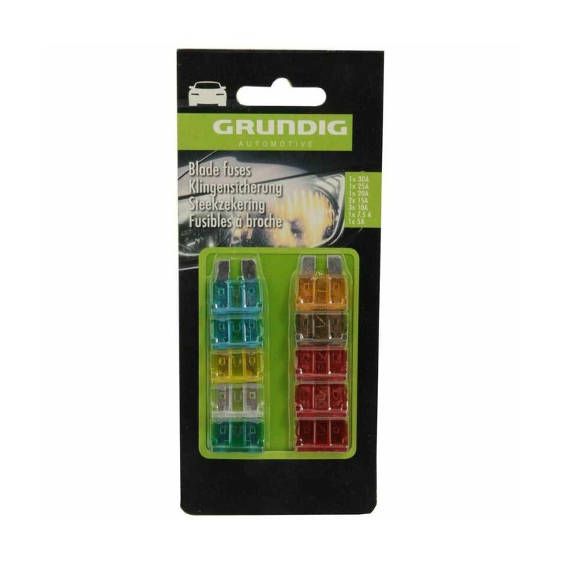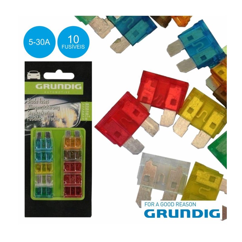 Conjunto de 10 fusíveis para automóvel. Incluí fusíveis de 5A/ 7.5A/ 10A/ 15A/ 20A/ 25A/ 30A. Fornecido em Blister.